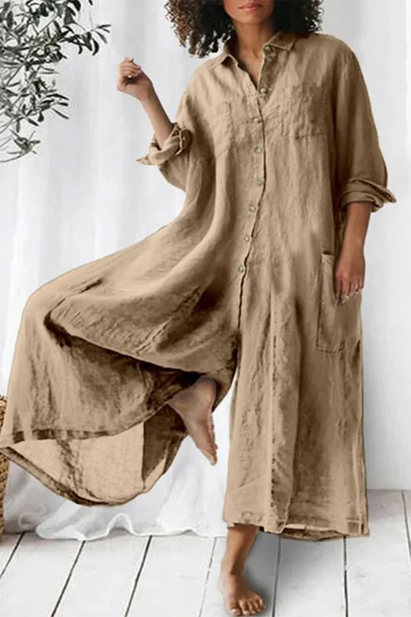 Casual holiday solid pocket buttons turn-down collar loose jumpsuits (3 couleurs)