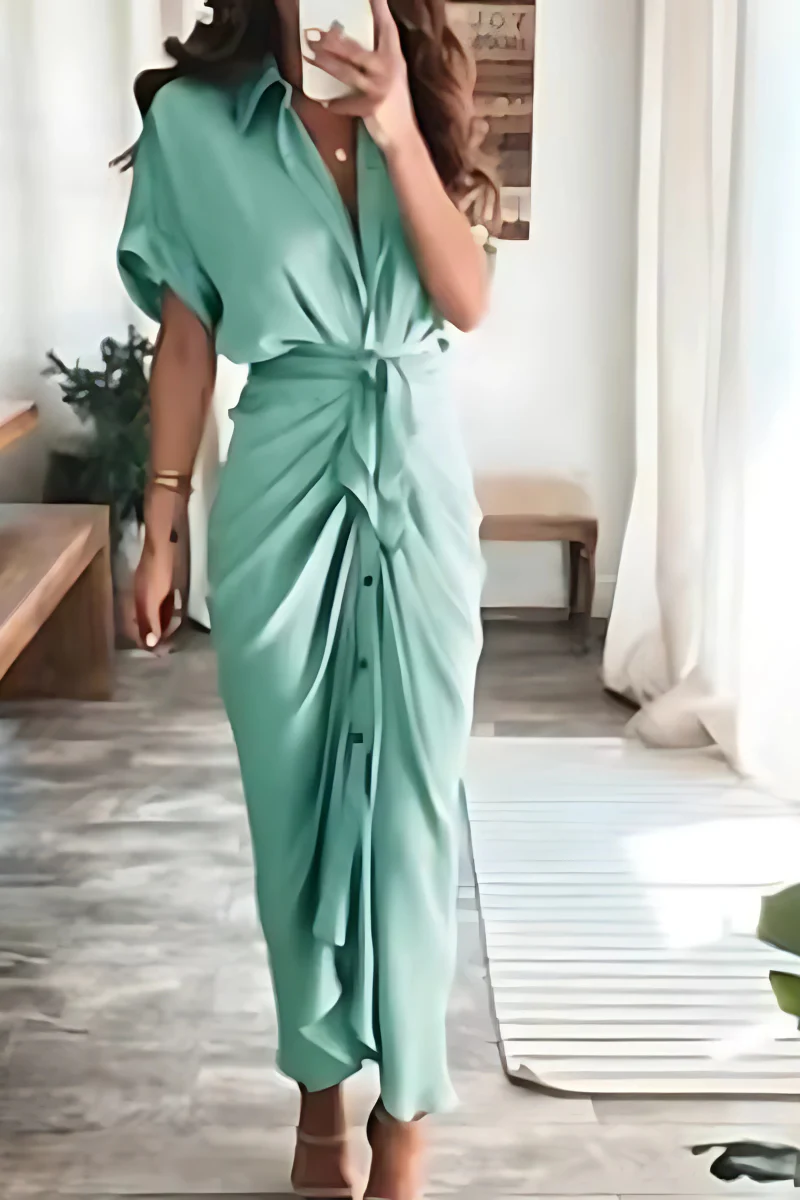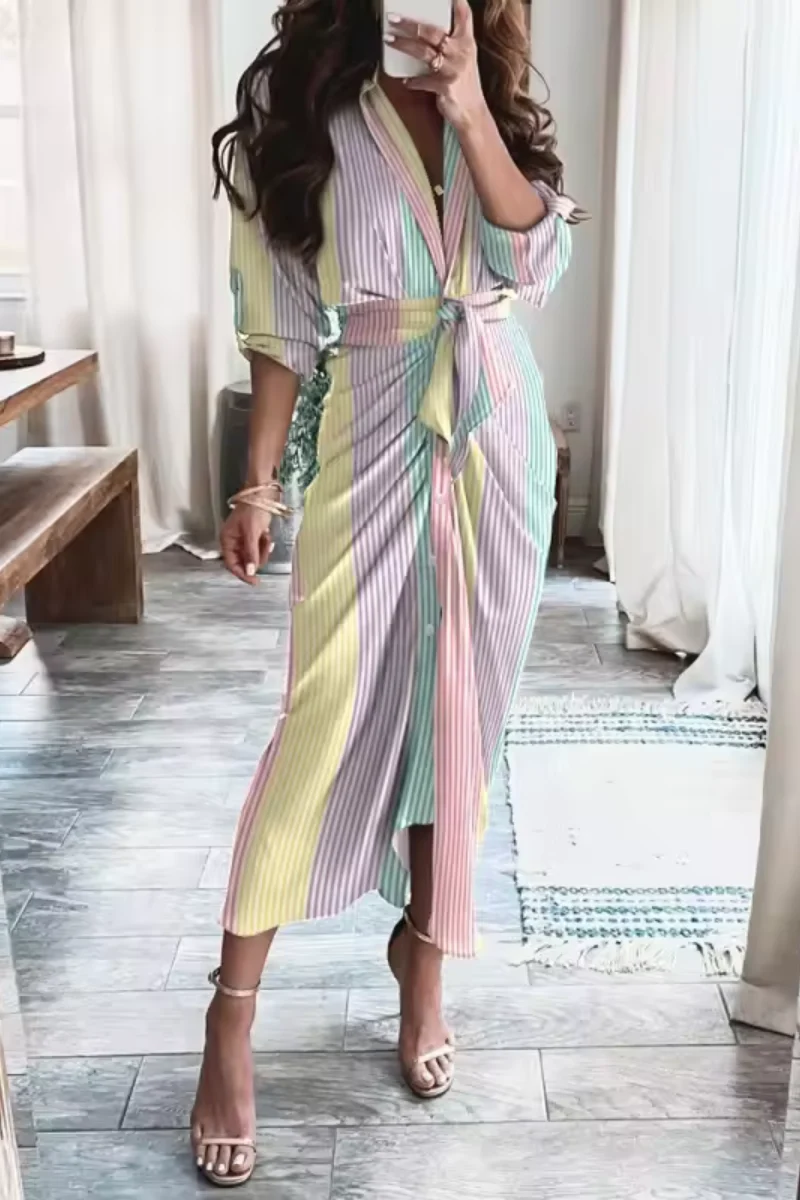 Entrez dans une sophistication sans effort avec cette robe chemise ajustée, conçue pour flatter toutes les courbes. Conçue dans des matières douces, naturelles et délicates, cette robe présente un superbe imprimé coloré qui ajoute une touche de personnalité à votre look. La fermeture à lacets à la taille et la silhouette ajustée créent une allure sophistiquée et sûre d’elle, idéale pour les femmes actives et soucieuses de la mode.