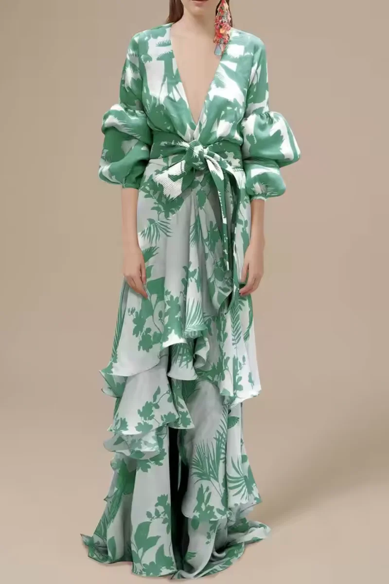 L’imprimé d’inspiration bohème se marie à merveille avec l’ourlet à volants et la coupe irrégulière, ajoutant du mouvement et de la personnalité à chacun de vos pas. Que vous dansiez pieds nus sur la plage ou que vous sirotiez du vin sous des lumières féeriques, cette robe allie élégance et liberté dans un look inoubliable.