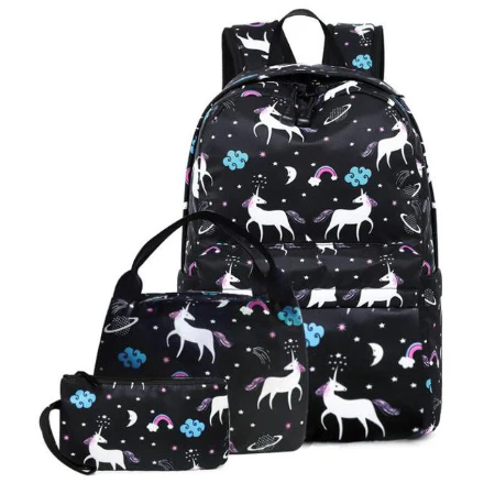 Le Sac à dos Licorne Noir comprend un cartable ergonomique, un sac isotherme et une grande trousse assortis.