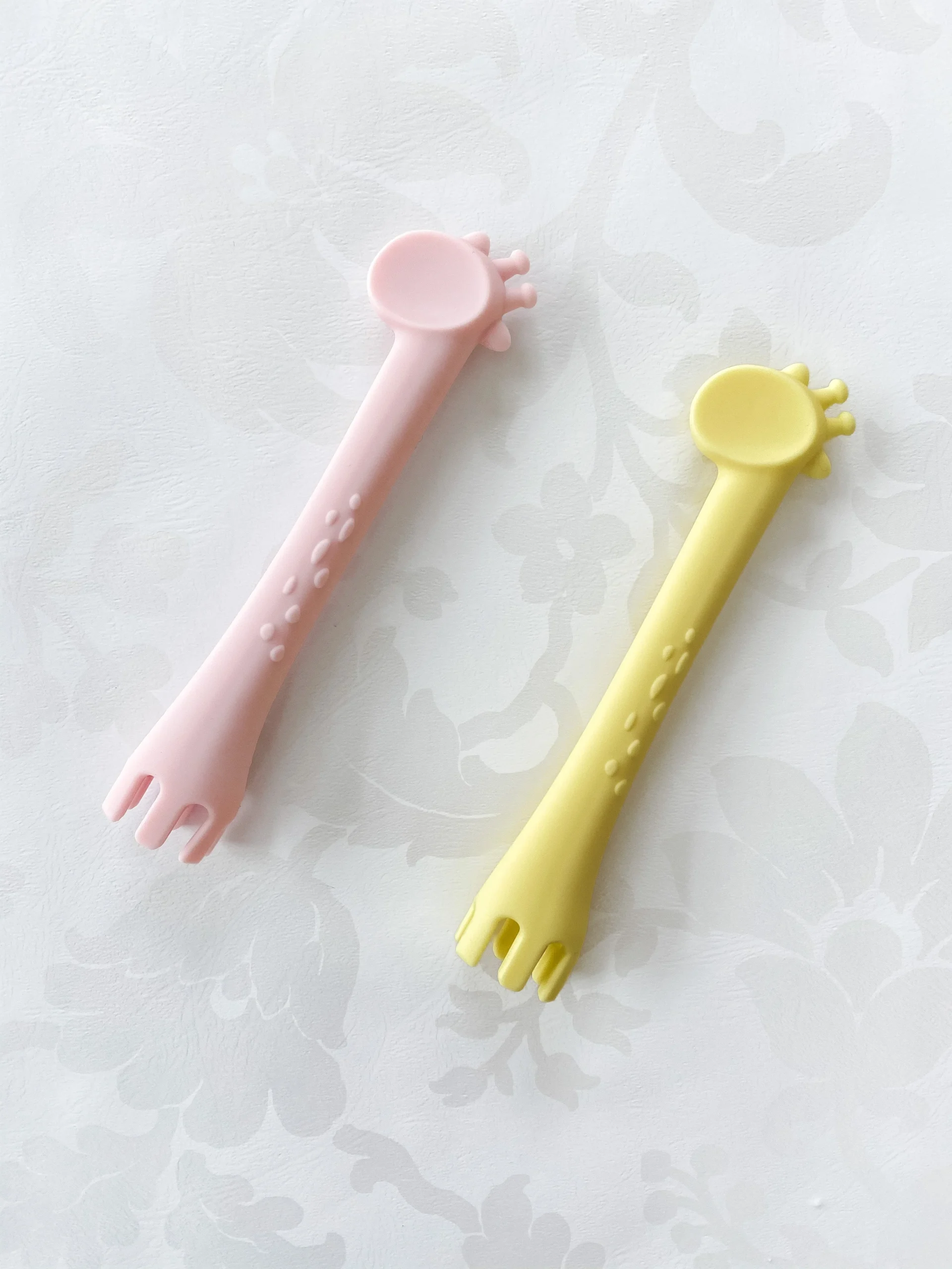 Utilisez la tête de la girafe comme cuillère pour les purées et les aliments plus liquides, tandis que les pattes peuvent servir de fourchettes pour le riz ou le macaroni.