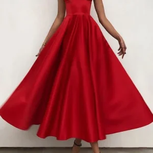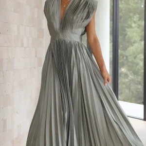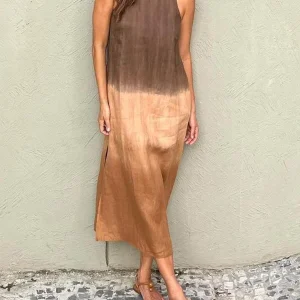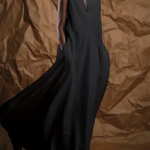 Meredith – robe longue à encolure profonde, sans manches, avec ceinture boutonnée