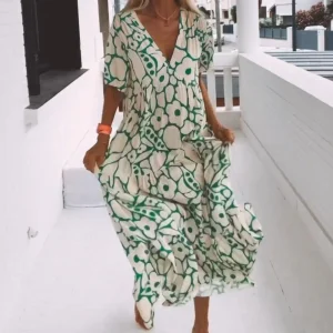 Merith – Col rond avec imprimé floral Robe longue décontractée à taille haute et manches courtes